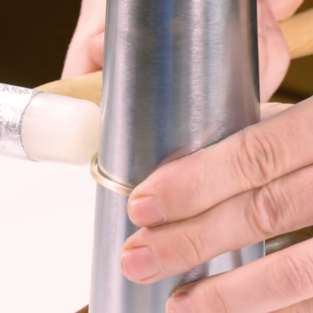- Shape the bangle: If the bangle changes shape slightly during firing, gently press and rotate it by hand until it is round. Alternatively, use a mandrel with a rawhide or nylon hammer to gently tap and rotate the bangle until it is perfectly round. Repeat on both sides. This not only shapes the bangle but also hardens the metal, adding strength. You can also add texture with texture hammers at this stage, keeping in mind that excessive hammering may slightly increase the size of your bangle.
