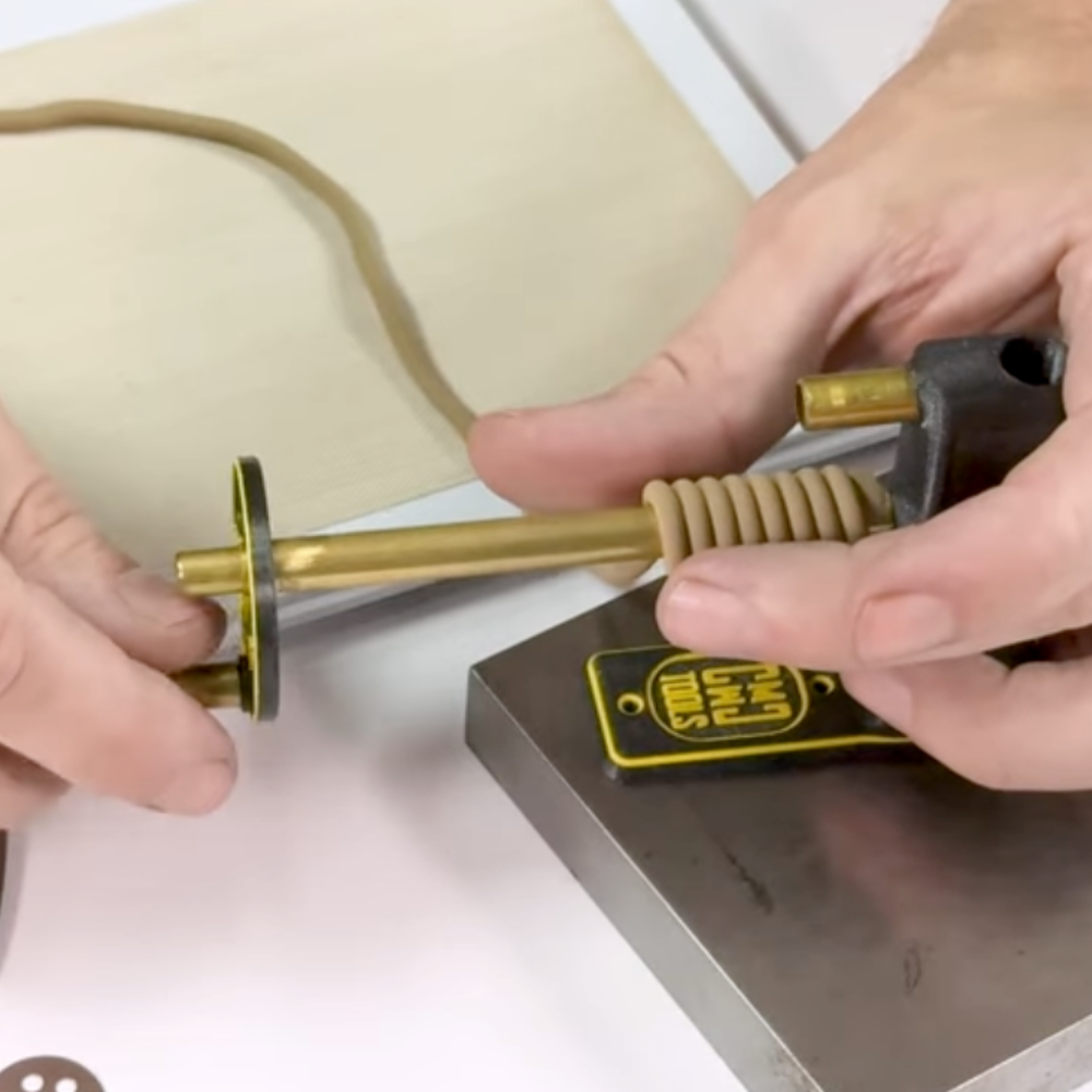 - Remove the brass tubes and place the 3mm tube in the small hole on the maker.