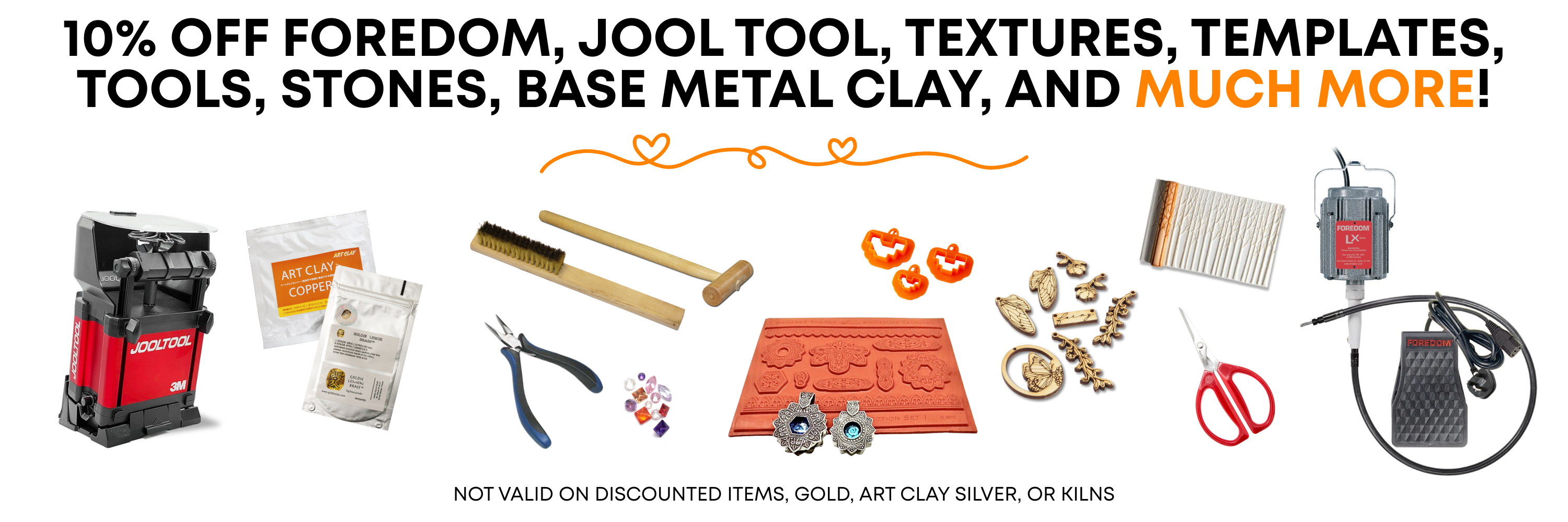 Valid on everything apart from gift vouchers/certificates, sales items, gold, Art Clay Silver products, courses, and kilns.